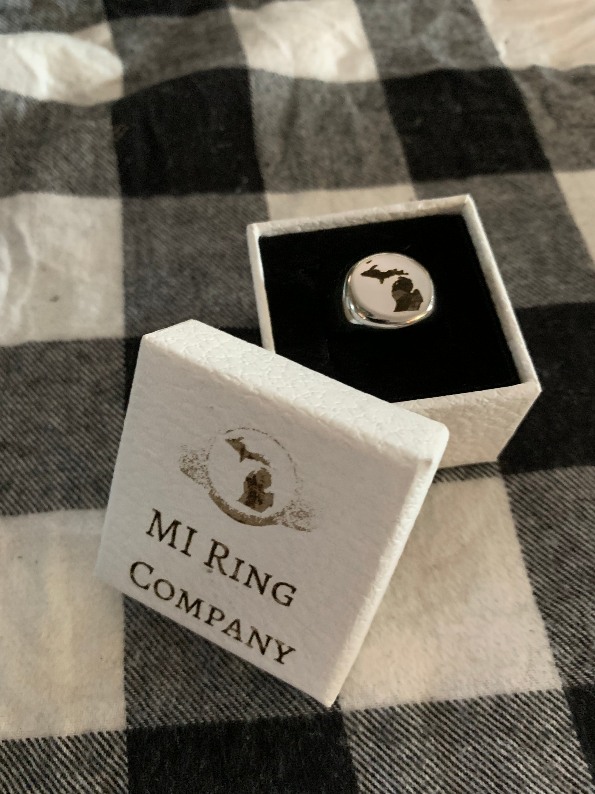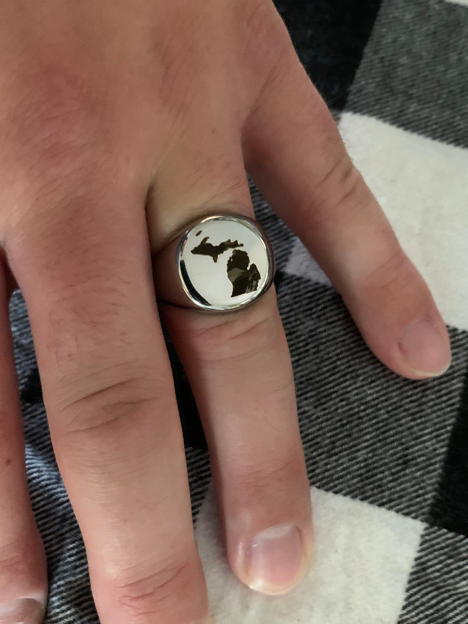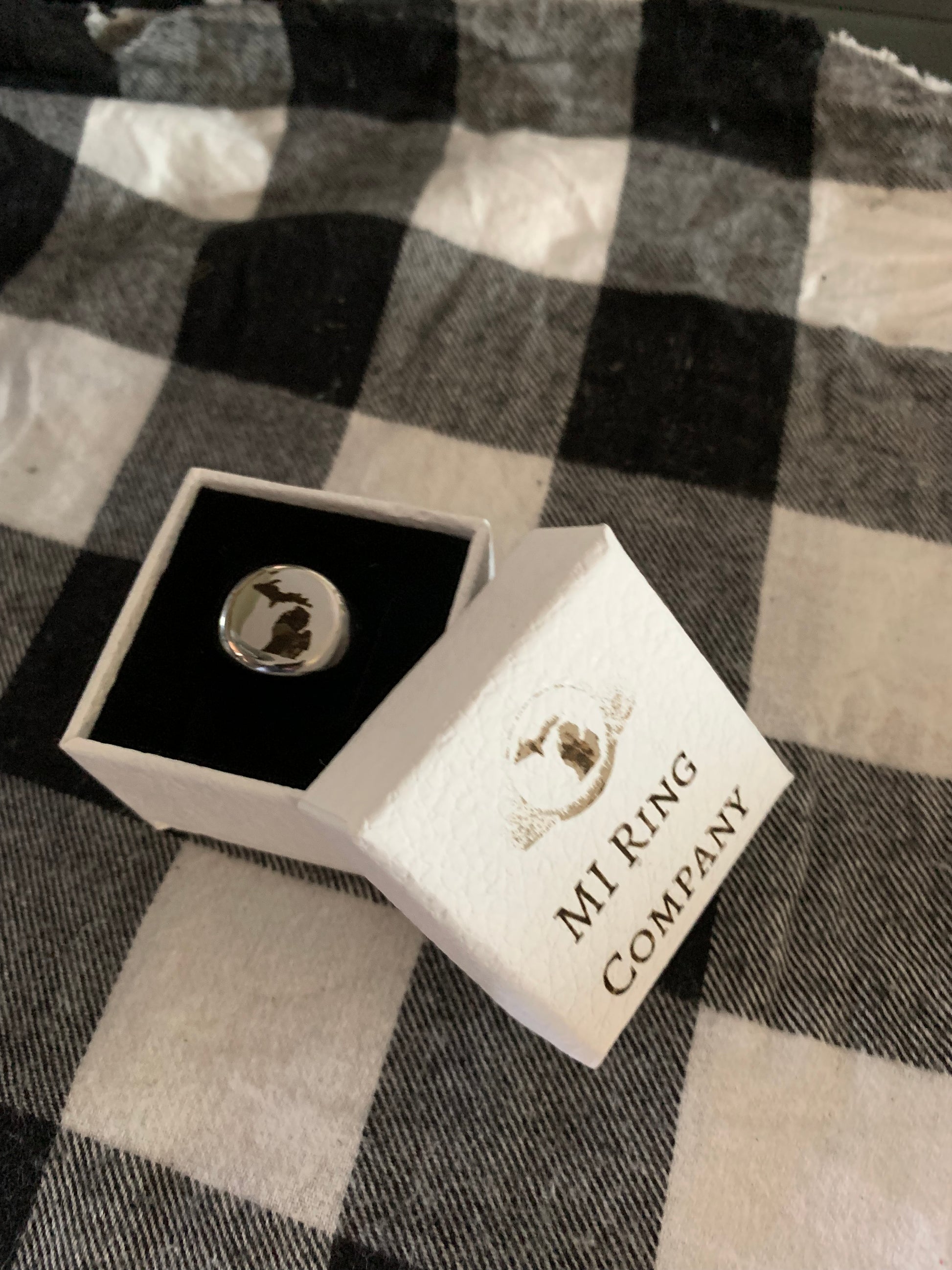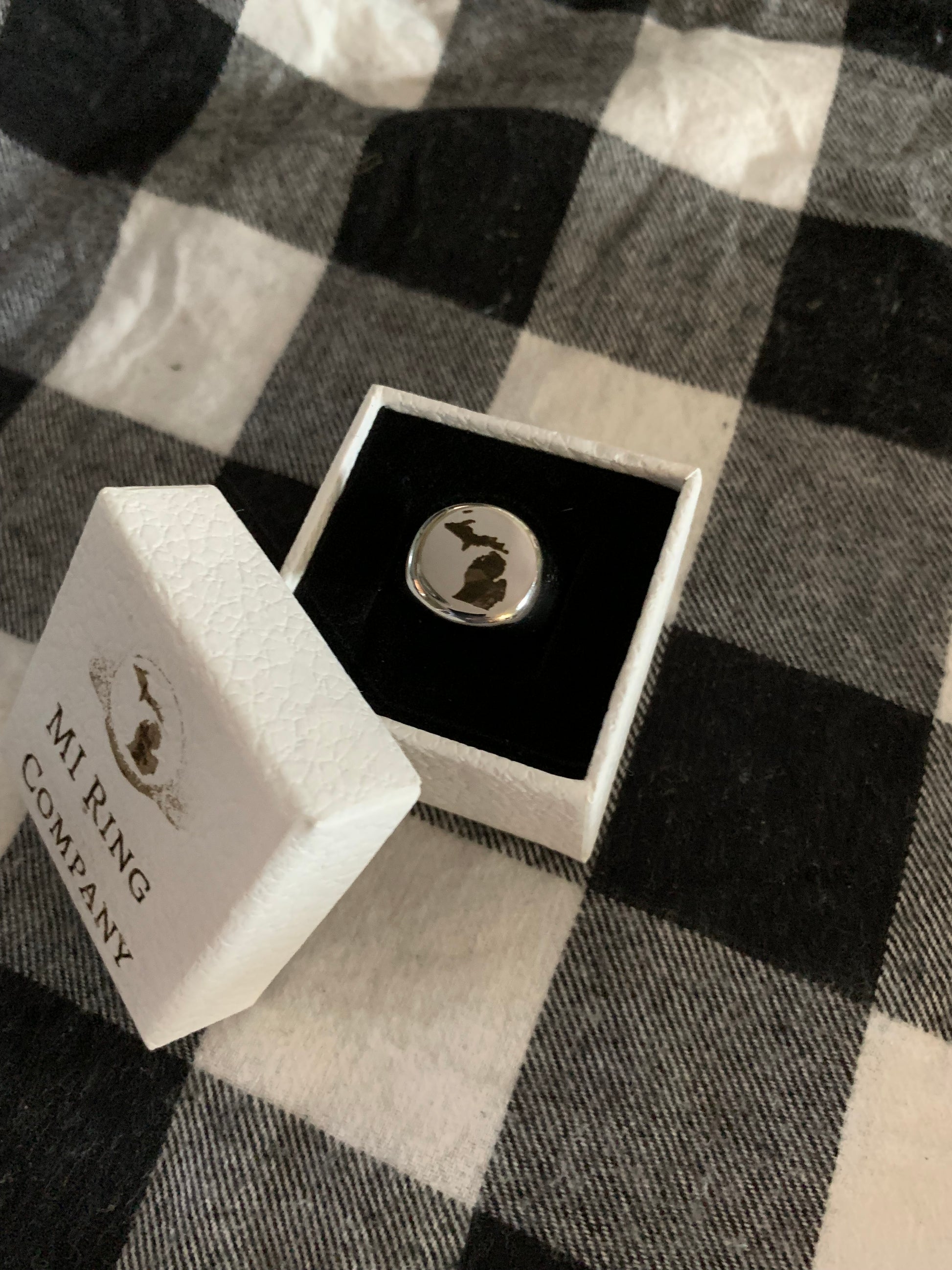 This polished stainless steel signet ring features a precision-engraved Michigan silhouette—both peninsulas, one bold identity. Sleek, round, and crafted for everyday wear or as a standout gift for any Michigander.