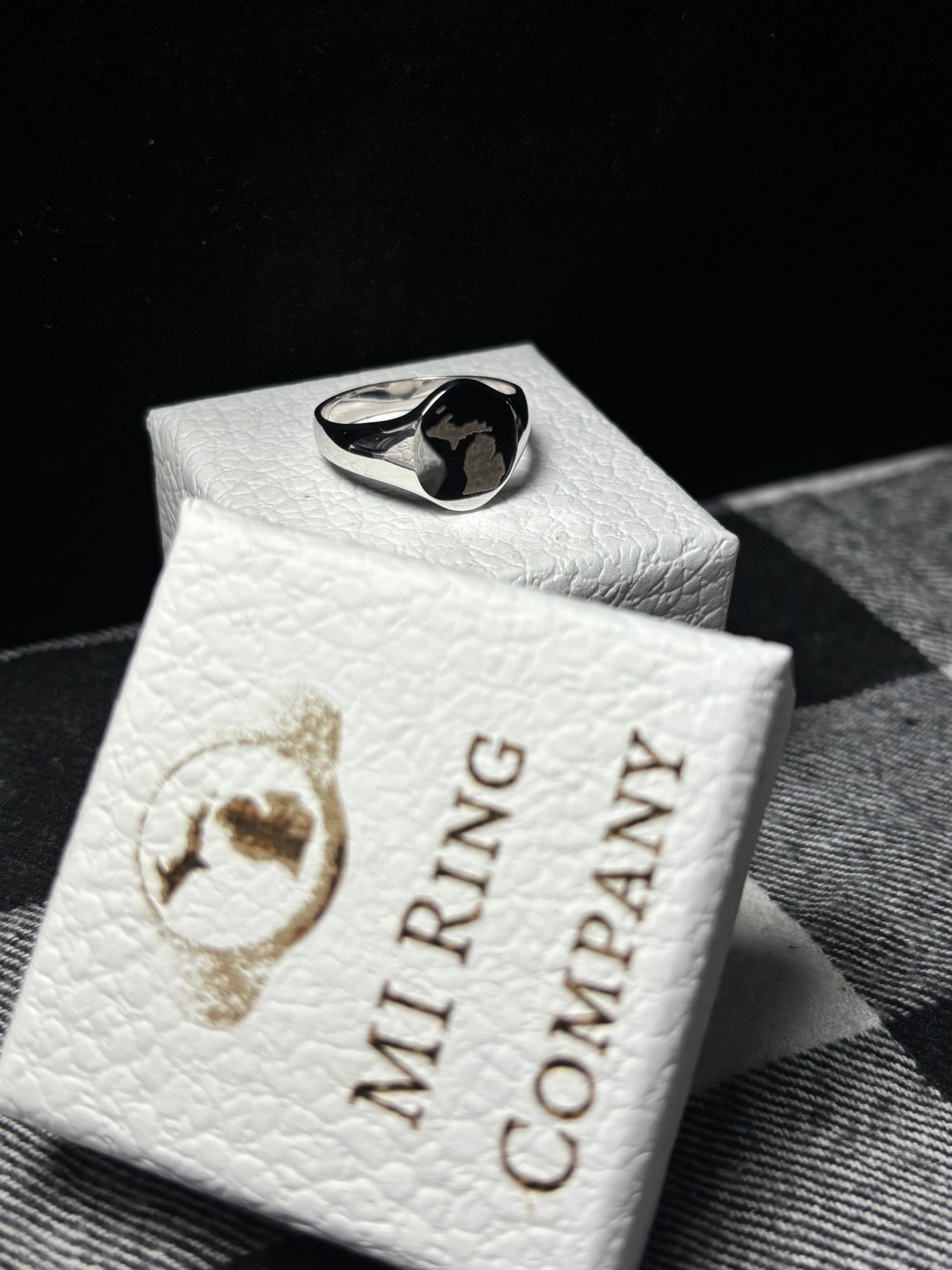 This delicate sterling silver signet ring features a finely engraved silhouette of the Upper and Lower Peninsulas. Sleek, simple, and timeless — it’s the perfect piece for those who want to wear their Michigan roots with elegance.