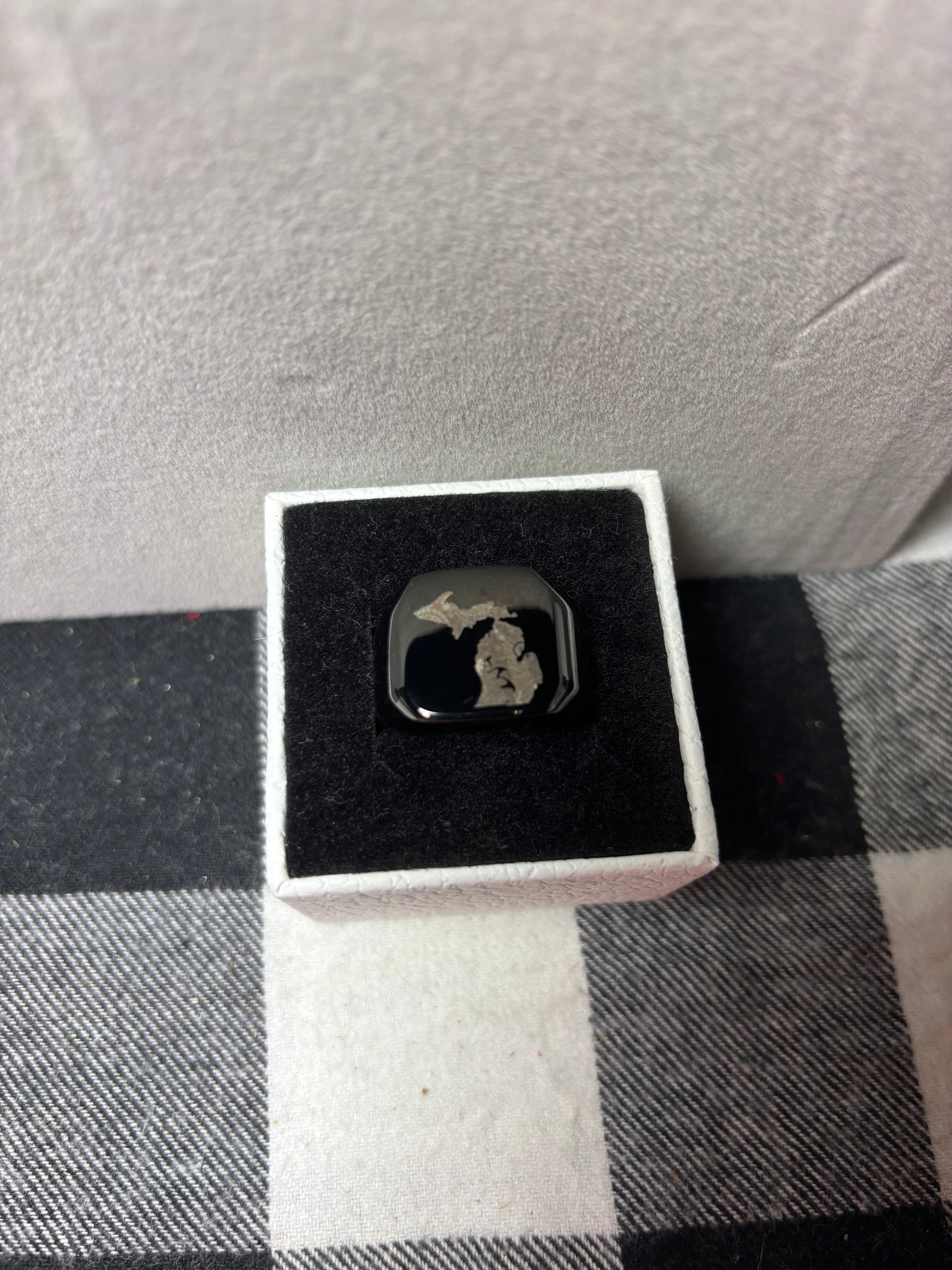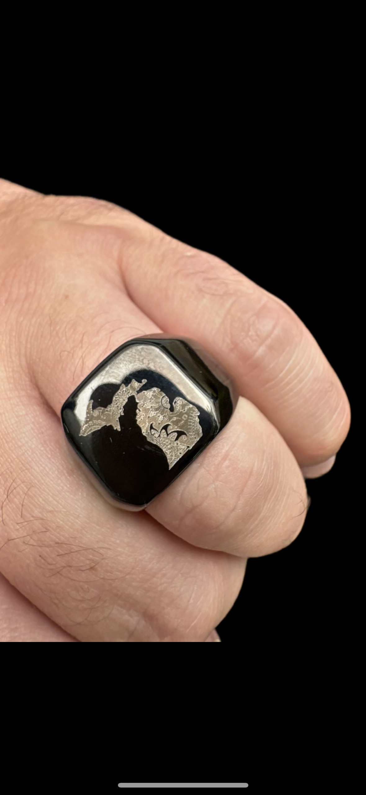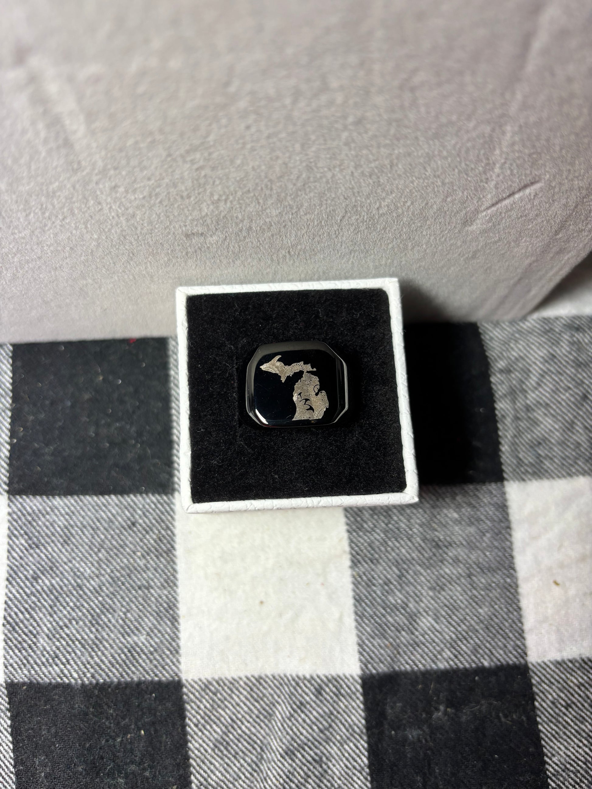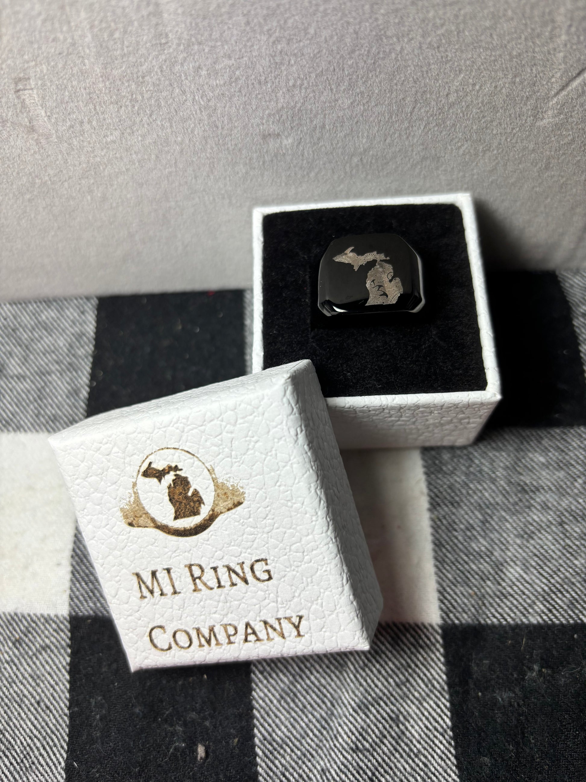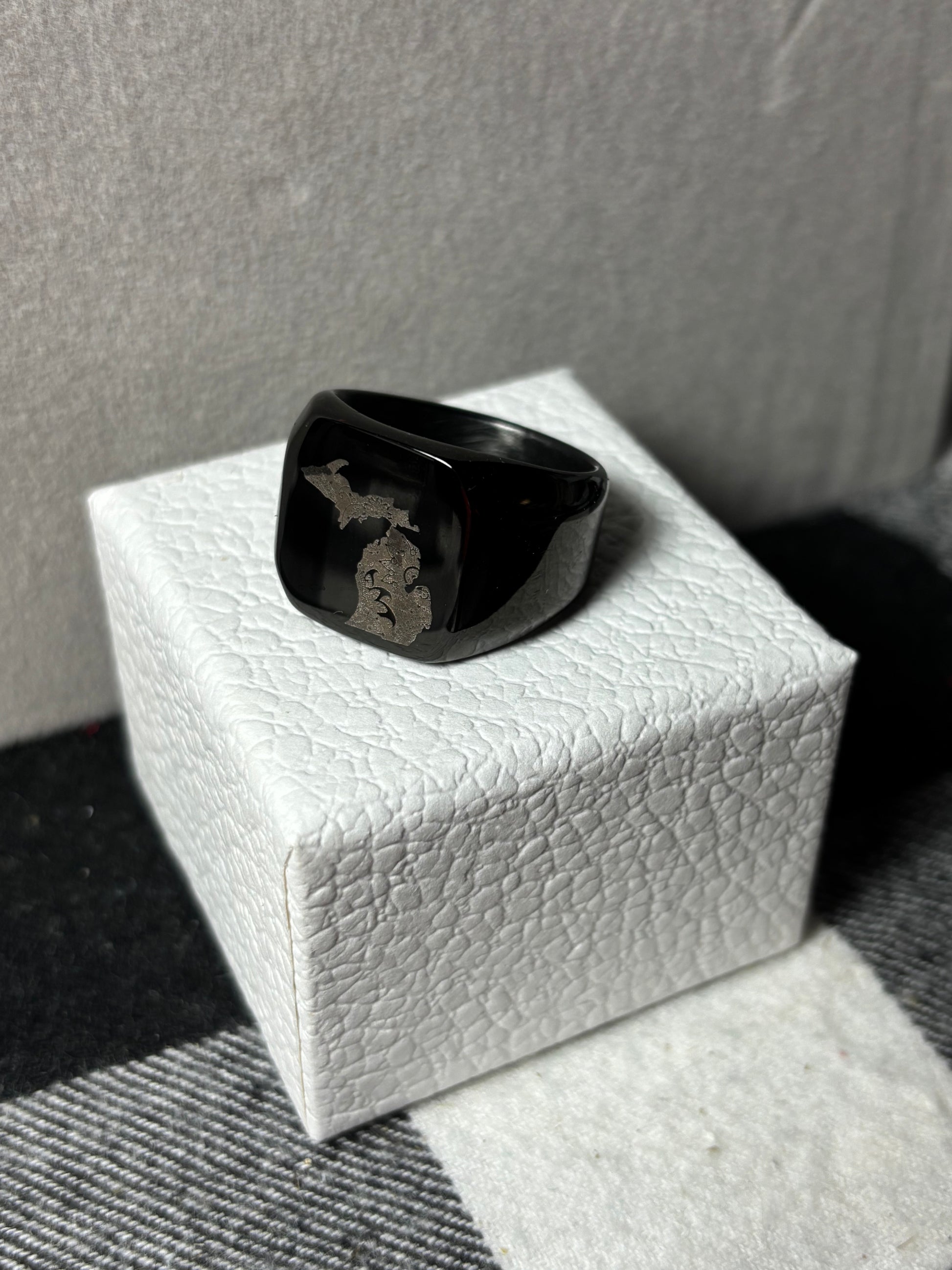 Celebrate your Michigan roots with this striking black stainless steel signet ring featuring the silhouette of the state laser-engraved with a detailed sun mandala design. These rings may anneal during engraving, so expect slight variations in the actual steel between rings. Whether you're representing the Great Lakes at home or from afar, this ring brings together modern style with hometown pride.