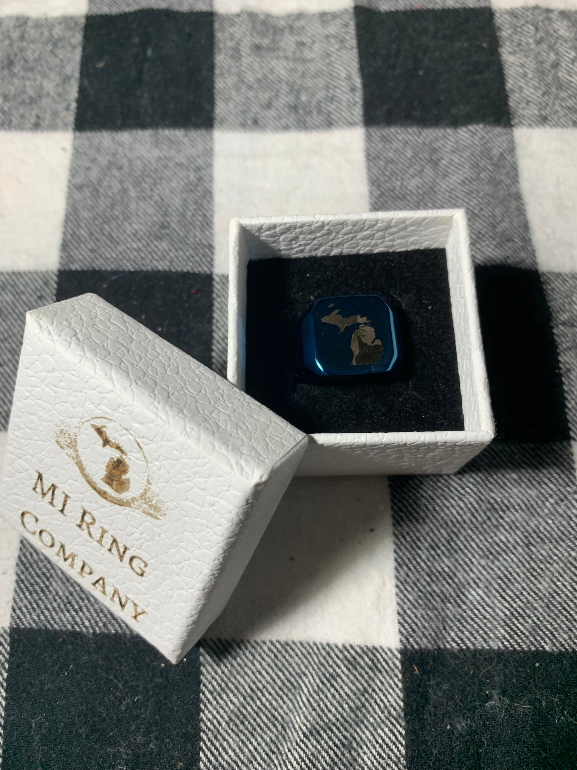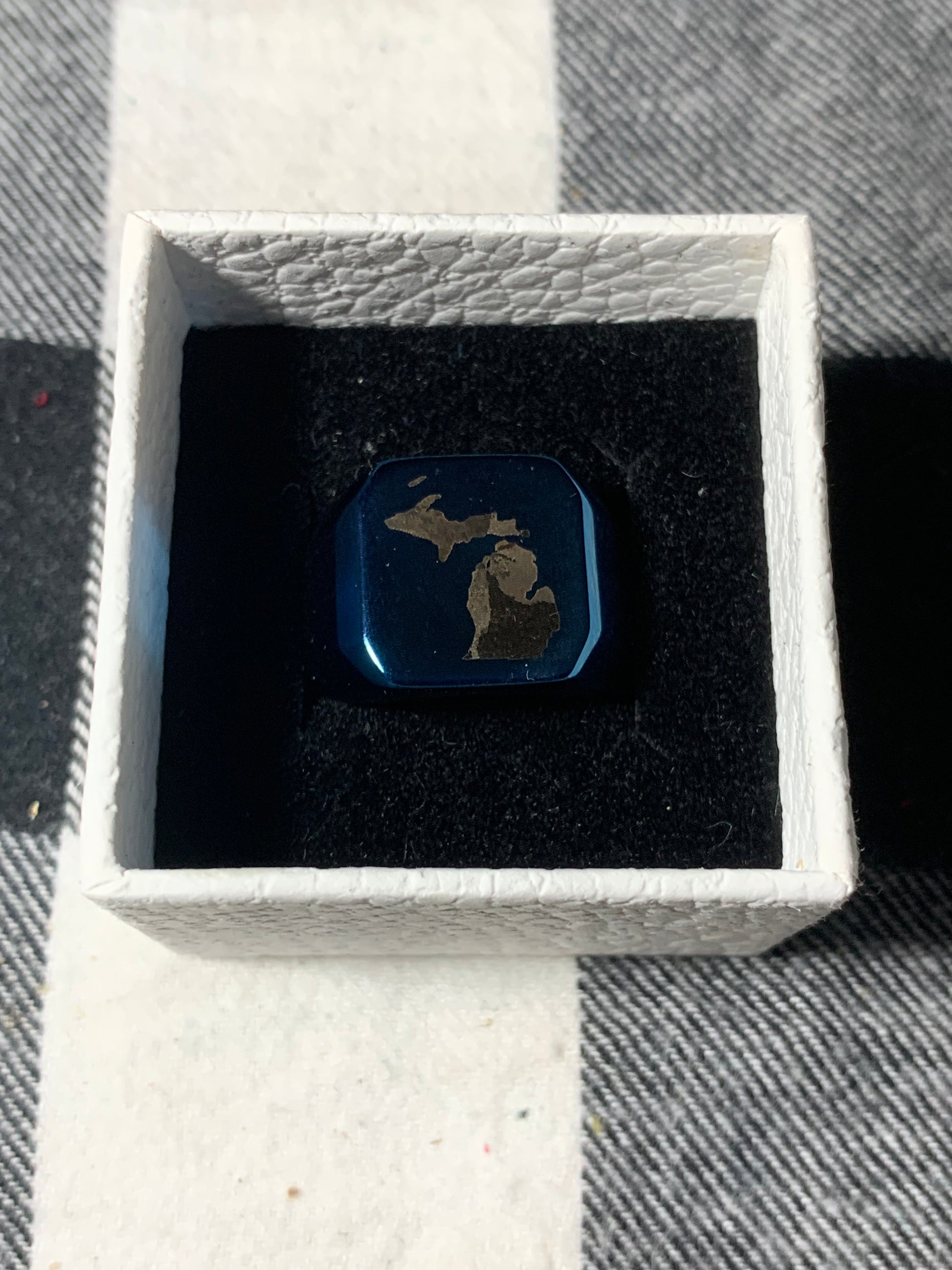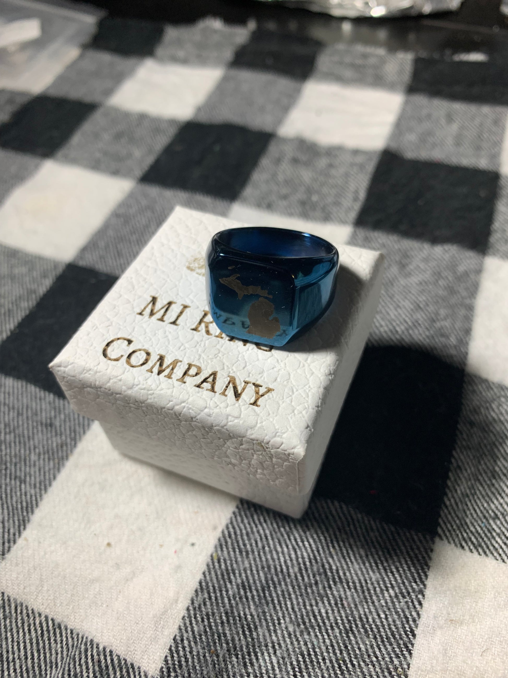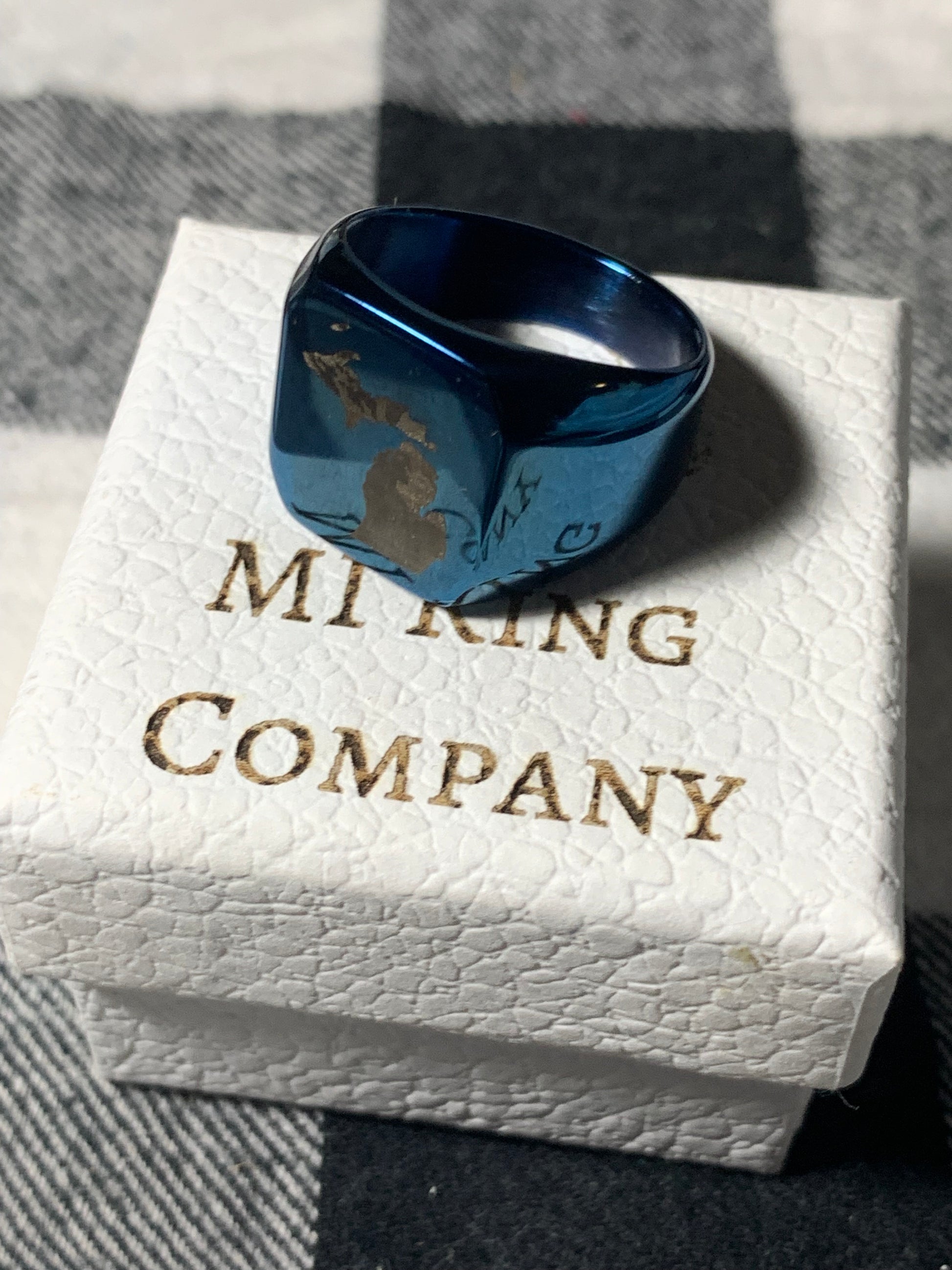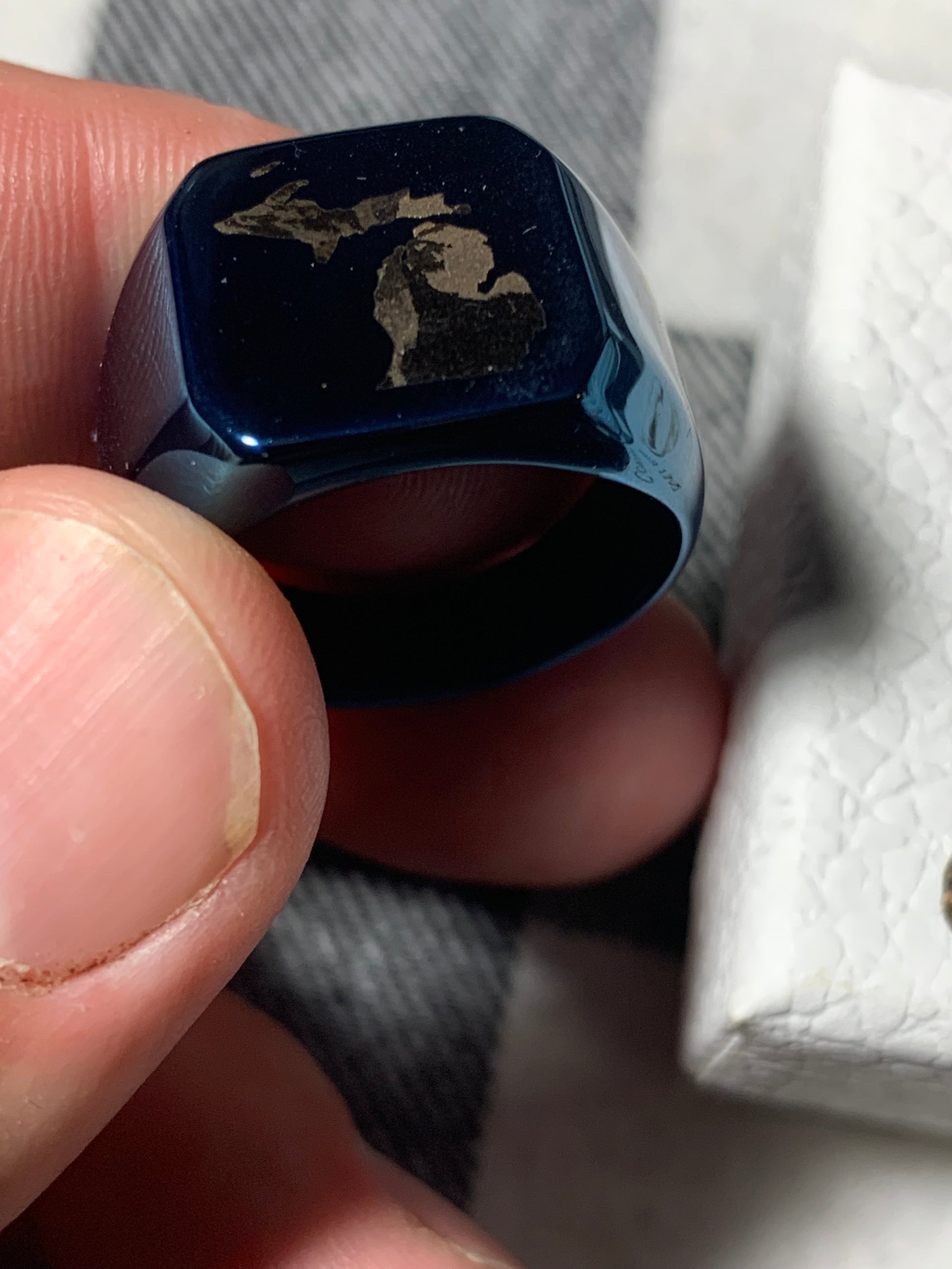 Engraving: Annealed Michigan state silhouette (each ring is unique)